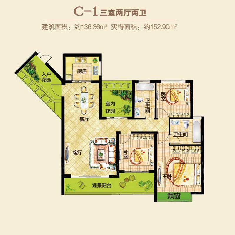 郑东春和景明3#4#C-1户型3室2厅2卫1厨-136.36㎡