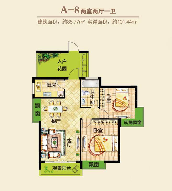 郑东春和景明1#2#楼A-8户型2室2厅1卫1厨-88.77㎡