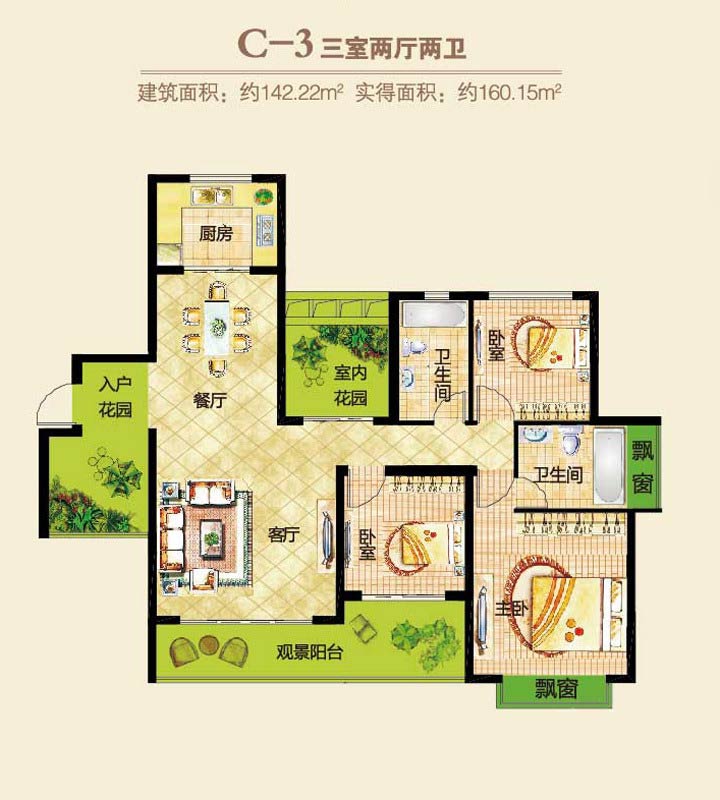 郑东春和景明3#4#C-3户型3室2厅2卫1厨-142.22㎡