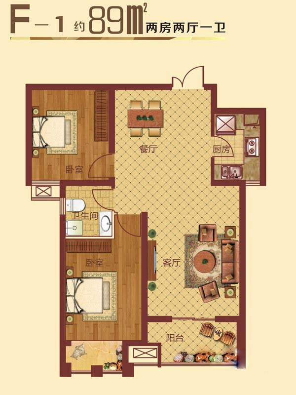 F-2户型2室2厅1卫1厨-89.00㎡