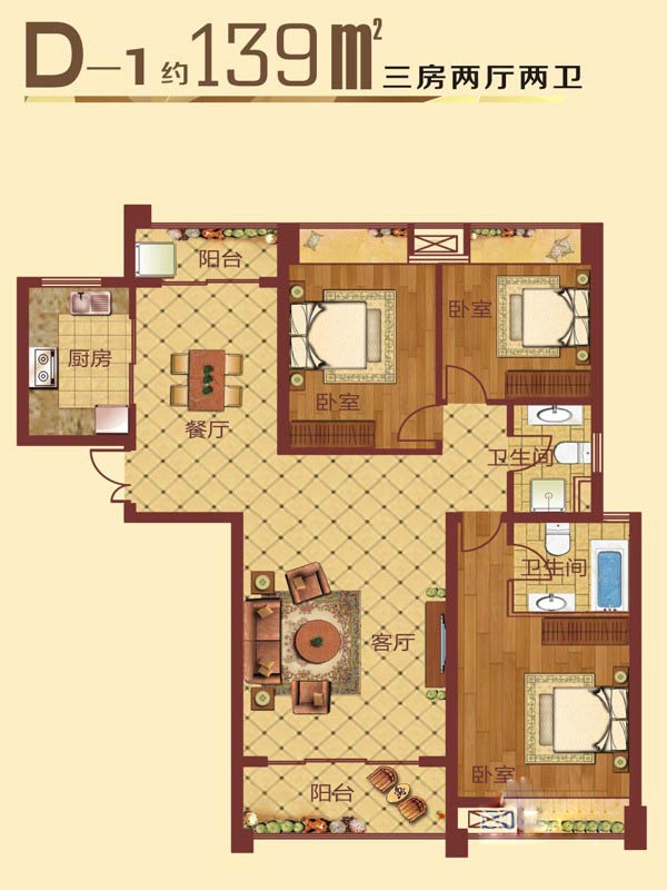 D-1户型3室2厅2卫1厨-139.00㎡