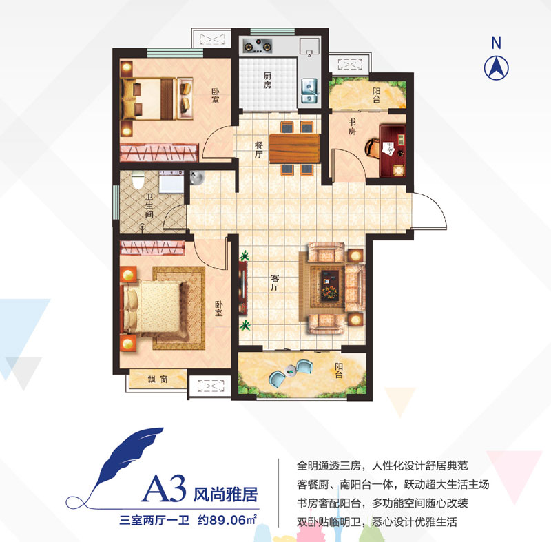 A3户型三室两厅一卫-约89.06㎡