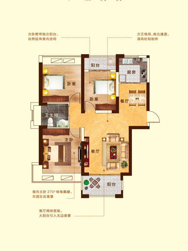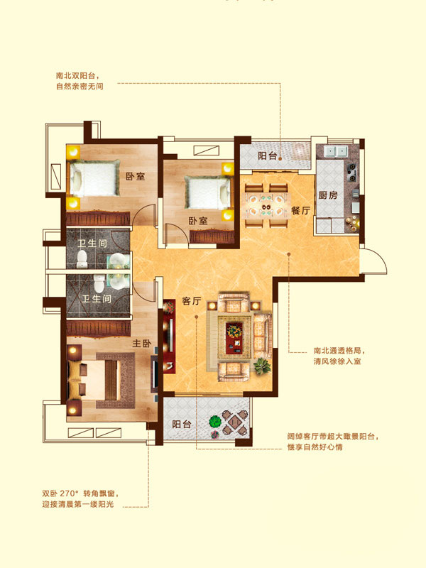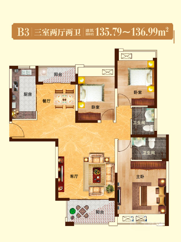 瀚宇天悦B1户型3室2厅2卫1厨-128.50㎡