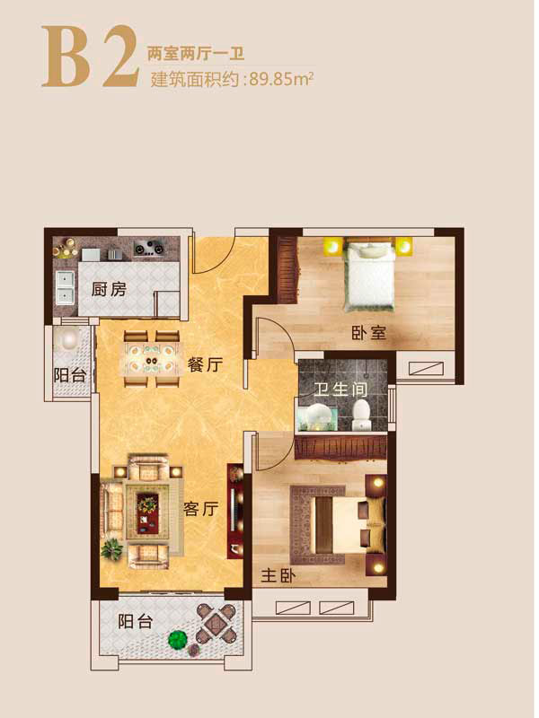 瀚宇天悦B2户型2室1厅1卫1厨-89.85㎡