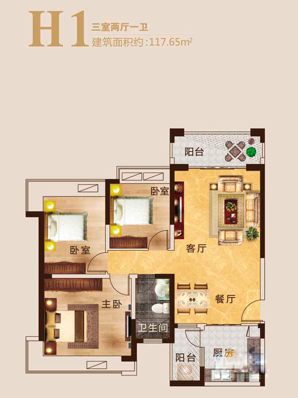 瀚宇天悦H1户型3室2厅1卫1厨-117.65㎡