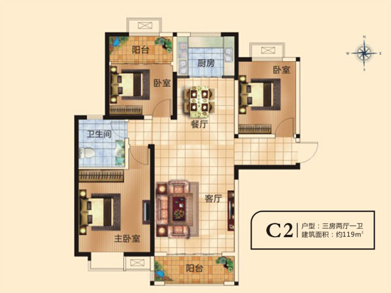 千鹿山一期C2户型3室2厅1卫1厨-119.00㎡