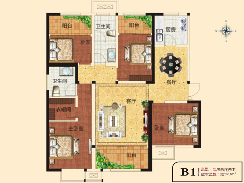 千鹿山一期B1户型4室2厅2卫1厨-142.00㎡