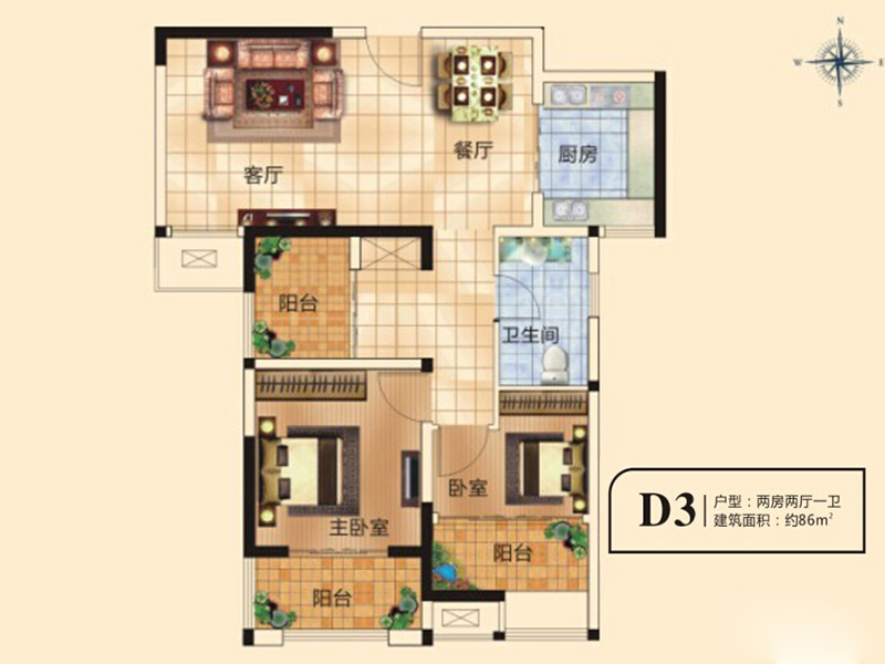 千鹿山一期D3户型2室2厅1卫1厨-86.00㎡