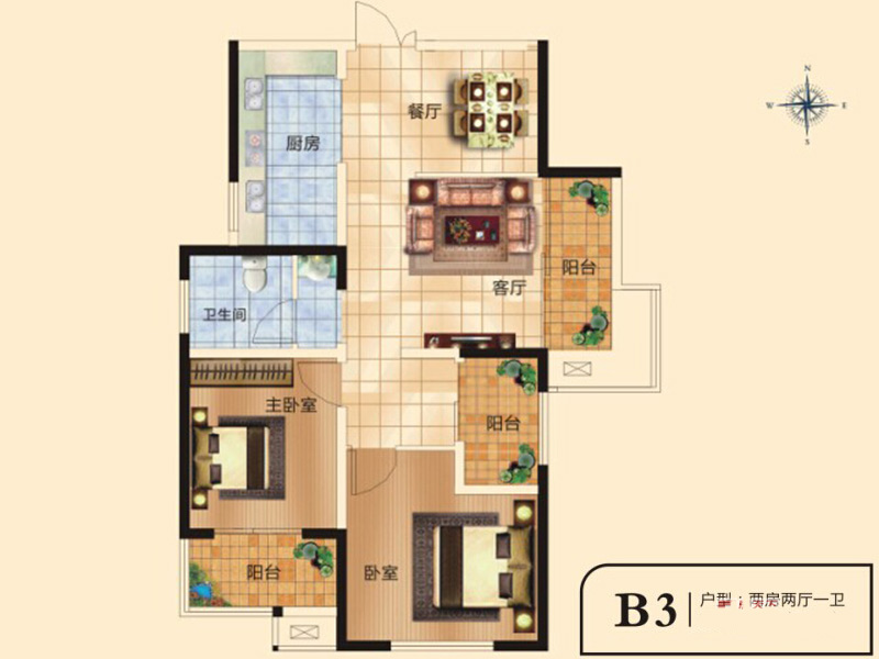 千鹿山一期B3户型2室2厅1卫1厨-96.00㎡