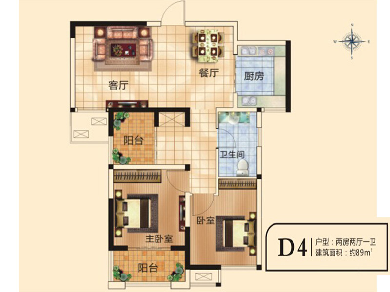 千鹿山一期D4户型2室2厅1卫1厨-89.00㎡