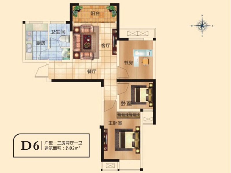 千鹿山一期D6户型3室2厅1卫1厨-82.00㎡