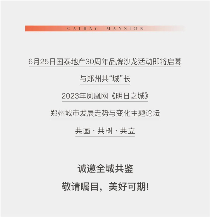 国泰地产作为与城市共建的积极践行者,一直以来都秉承着不断探索的行业精神,在美好生活的时代浪潮中矢志前行,与更多的城市规划相融汇聚,共建美好未来。恰逢国泰地产30周年,恰逢国际郑振翅腾飞。时代的机遇与挑战,伴随着城市的焕新集聚迸发,国泰地产将以城市运营商身份,肩负共建使命,以国际视野链接优质资源,为城市注入新的生活方式,为城市持续创造更长远的价值,推动郑州高质量发展,助力郑州更美好的未来。
