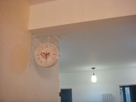 客厅有个房梁,地面就刚好以这个房梁为界,里面铺的木地板,外面铺瓷砖。在房梁一角挂的田园风格钟表。