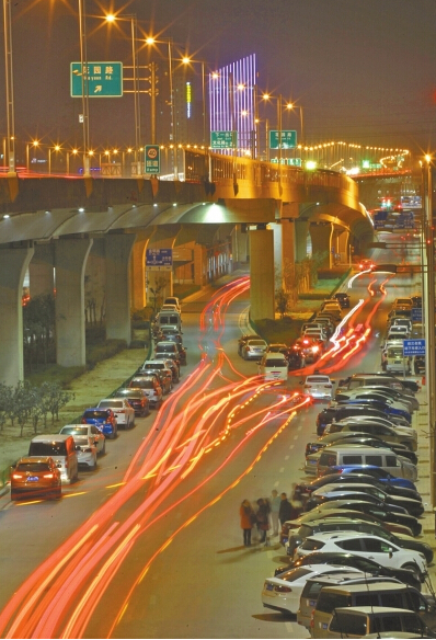 经三路北环高架桥下停车混乱,甚至连机动车辅道左转待转区也停了车,想左转的车常被停放的车误导,排队苦等(注:上图红色光带为记者拍摄的汽车尾灯所留下的行驶轨迹)。