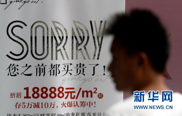 9月27日,在杭州一个房产交易会上,一位购房者从一个楼盘的降价广告前走过。新华社记者 王定昶 摄