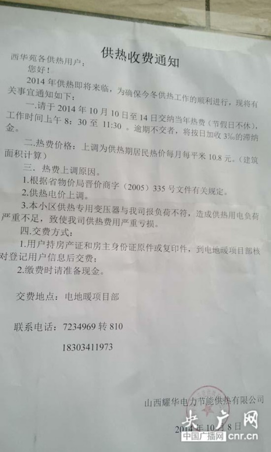 供热公司贴出的供暖费涨价通知(央广网记者 肖源 摄)