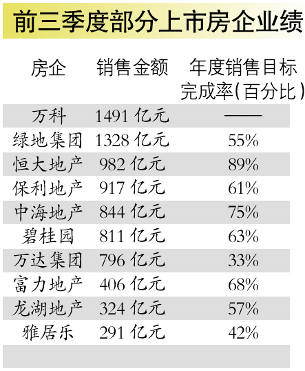 近期公开的资料数据显示,今年前三季度,仅有恒大、中海、合景泰富等少数几家企业完成了七成以上的销售指标,仅有万科、绿地两家销售额超千亿。在记者统计的超过20家品牌房企中,销售完成率不到七成的占七成,部分品牌房企指标完成率不到半数。而去年的这个时候,多家重点房企已完成或接近完成年度销售任务。