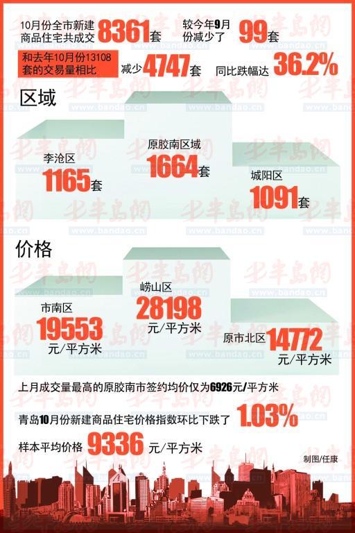 11月1日,青岛市房地产交易中心公布了上月楼市成交情况。数据显示,10月份全市新建商品住宅共成交8361套,较今年9月份减少了99套;但和去年10月份13108套的交易量相比,减少了4747套,同比跌幅达36.2%。