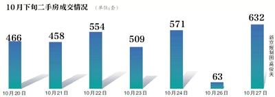 昨日,记者从北京市住建委网站获悉,27日北京二手房住宅成交达到632套,创下年内单日成交量新高。而从10月20日至10月27日,8天有6天的成交量超过450套,在10月下旬,北京二手房成交呈现井喷态势。