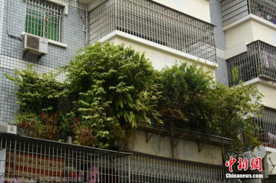 2014年11月8日,厦门一高校的宿舍楼上有一户窗台种满了植物,满满的都扑了出来看不出原本的面貌,令人惊讶。图片来源:东方ic 版权作品 请勿转载
