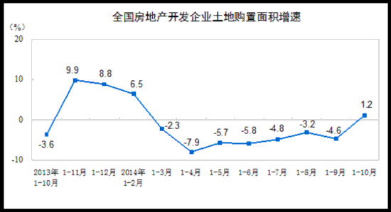 1-10月份,房地产开发企业土地购置面积26972万平方米,同比增长1.2%,1-9月份为下降4.6%;土地成交价款7747亿元,增长20.4%,增速提高8.9个百分点。