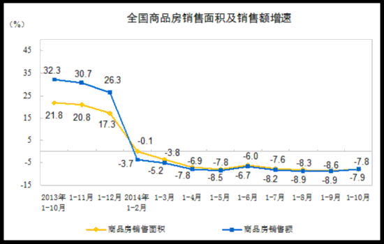 10月份当月,商品房销售面积11362万平方米,同比下降1.6%,降幅比上月减缓8.7个百分点;商品房销售额7158亿元,同比下降0.7%,降幅比上月减缓8.2个百分点。