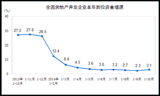 1-10月份,房地产开发企业到位资金100241亿元,同比增长3.1%,增速比1-9月份提高0.8个百分点。其中,国内贷款17735亿元,增长11.1%;利用外资489亿元,增长17.6%;自筹资金42232亿元,增长13.8%;其他资金39786亿元,下降9.0%。在其他资金中,定金及预收款24213亿元,下降11.2%;个人按揭贷款10895亿元,下降4.3%。