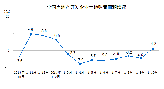 1-10月份,房地产开发企业土地购置面积26972万平方米,同比增长1.2%,1-9月份为下降4.6%;土地成交价款7747亿元,增长20.4%,增速提高8.9个百分点。