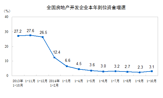 1-10月份,房地产开发企业到位资金100241亿元,同比增长3.1%,增速比1-9月份提高0.8个百分点。其中,国内贷款17735亿元,增长11.1%;利用外资489亿元,增长17.6%;自筹资金42232亿元,增长13.8%;其他资金39786亿元,下降9.0%。在其他资金中,定金及预收款24213亿元,下降11.2%;个人按揭贷款10895亿元,下降4.3%。
