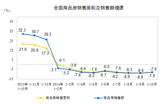 10月份当月,商品房销售面积11362万平方米,同比下降1.6%,降幅比上月减缓8.7个百分点;商品房销售额7158亿元,同比下降0.7%,降幅比上月减缓8.2个百分点。