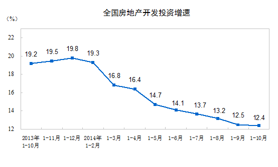 新华网消息 国家统计局13日发布数据显示,2014年1-10月份,全国房地产开发投资77220亿元,同比名义增长12.4%,增速比1-9月份回落0.1个百分点。其中,住宅投资52464亿元,增长11.1%,增速回落0.2个百分点。住宅投资占房地产开发投资的比重为67.9%。