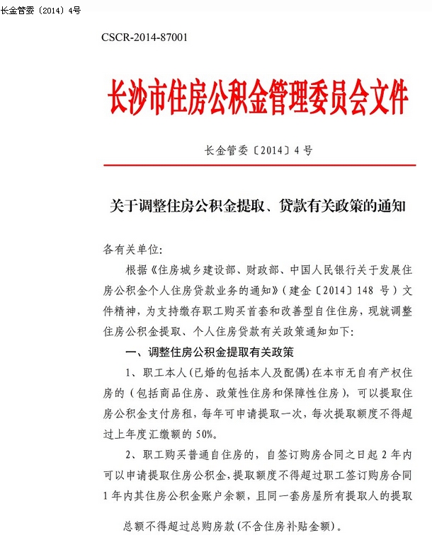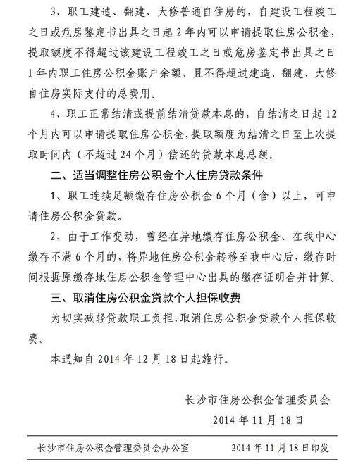 《通知》将自2014年12月18日起执行,其中规定,职工本人(已婚的包括本人和配偶)在本市无自有产权住房的(包括商品住房,政策性住房和保障性住房),可以提取住房公积金支付房租,每年可以申请提取一次,每次额度不能超过上年度汇缴额的50%。同时,在长沙连续缴存公积金6个月即可申请公积金个人住房贷款,在异地缴存住房公积金,在长沙购买自住住房的,凭缴存地住房公积金管理中心出具的缴存证明,也可申请公积金个人贷款。此外,通知还明确规定,为切实减轻贷款职工负担,将取消住房公积金个人担保收费。