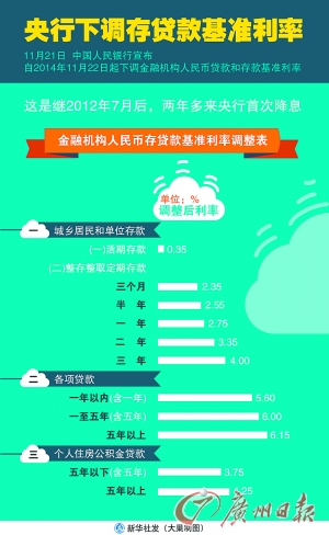 11月21日,央行宣布,自11月22日起下调金融机构人民币贷款和存款基准利率。
