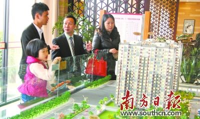 在新兴某房地产售楼中心,顾客边看楼盘模型边向售楼员咨询房贷政策。谭笑 摄