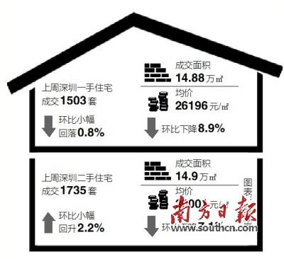 根据深圳中原研究中心的监测,上周深圳一手住宅成交1503套,环比小幅回落0.8%,成交面积为14.88万 。均价为26196元/ ,环比下降8.9%。