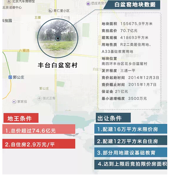 资料显示,丰台区花乡白盆窑村1516-0665等地块用地性质为二类居住及基础教育用地,建设用地规模为41.87万平方米,起拍价70.7亿元,刷新了北京土地市场历史起拍价最高记录。该宗地配建的限价商品房销售限价为1.7万元/平方米,配建的自住型商品房销售限价为2.9万元/平方米,为目前最贵的自住房。
