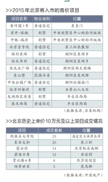 中原地产统计数据显示,北京历史上单价每平方米10万元及以上的项目有成交的只有6个,其中成交超过10套的项目只有4个。中原地产首席分析师张大伟分析表示,2015年,佳兆业广场、远洋刘娘府地块、保利首开东坝等大量主力户型在200平方米以上的高端项目将扎堆入市,这将导致高价住宅市场竞争进一步加剧,高价项目将进入肉搏时代。 京华时报记者邢飞