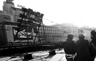 昨天中午,数名工人爬上“动批”天皓成服装批发市场的楼顶,用切割机将巨大的钢架切断,十多分钟后,“天”字应声而倒,也拉开了“动批”搬迁的序幕。今天上午,天皓成内依然正常营业。记者从有关方面了解到,目前商户们的押金款已到位,即将退款工作,最迟周三发放完毕,随即批发城将停业。