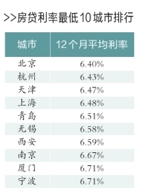 统计显示,截至2014年12月31日,十大利率最低的城市依次为北京、杭州、天津、上海、青岛、无锡、西安、南京、厦门和宁波。北京的平均利率全国最低,12月更低至9.4折。除北京以外,杭州、天津、上海全年平均利率也在基准之下。