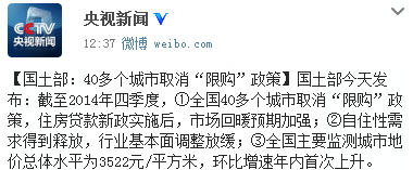 中新网1月15日电 据中央电视台新闻中心官方微博“央视新闻”消息,国土部今日发布:截至2014年四季度,全国40多个城市取消“限购”政策。