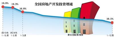 在房地产开发投资一项上,统计数据显示,2014年全国完成95036亿元投资,增速较2013年回落9.3个百分点。全年数据显示,2014年全国房地产开发投资增速一直处于下降状态。从2014年1-2月的19.3%一路下降到年末的10.5%。