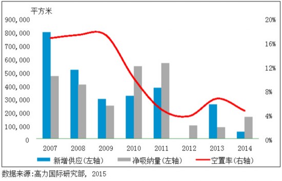 图1北京甲级写字楼年度新增供应、净吸纳量以及空置率