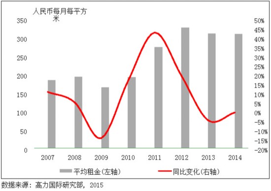 截至2014年底,北京甲级写字楼租金达人民币309.4元每月每平方米,同比下降0.5%,主要原因是业主提供优惠措施和租金折扣以期保留优质租户。CBD区域录得最大的租金降幅,同比下降2.1%,在一定程度上被新入市项目低于市场平均水平的租金所拉低。相反,金融街子市场在可供租赁面积有限以及金融企业租赁需求增长的作用下,租金同比增长2.1%。尽管北京市场租金自2013年第一季度录得人民币327.9元每月每平米的最高点之后,已历经连续七个季度的调整,但仍为全国最高。