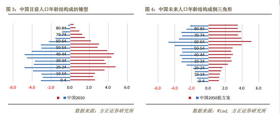 由于实施了几十年的计划生育,2010年中国的年龄结构呈纺锤形,劳动力比例大,经济增长势头不错,但是也导致内需不足。这种结构是不稳定的,并且很快就要变成高度不稳的倒三角形:劳动力严重短缺、高度老年化、经济丧失活力。