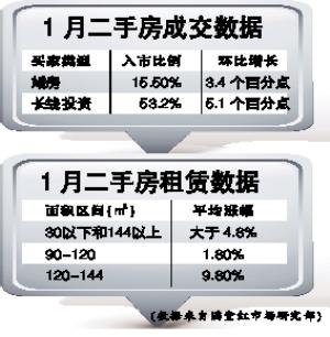 满堂红市场研究部高级经理周峰分析,90至120平方米的物业多数是三房单位,这类物业既不能像小面积单位那样受单身客户追捧,也不能如大面积单位那样被企业高管或外籍客户所选择,故其成交比例一向较小。今年1月90至120平方米的物业出租成交比例为13.2%,低于2014年全年16.2%的水平,春节前难以找到合适租客,预计这种情况要到节后才有改观。(记者 罗莎琳 田桂丹 实习生 林颖)
