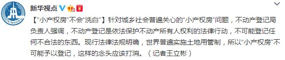 人民网北京2月26日电 据新华社新华视点微博消息,针对城乡社会普遍关心的“小产权房”问题,不动产登记局负责人强调,不动产登记是依法保护不动产所有人权利的法律行动,不可能登记任何不合法的东西。现行法律法规明确,世界普遍实施土地用管制,所以“小产权房”不可能予以登记,这样的念头应该打消。
