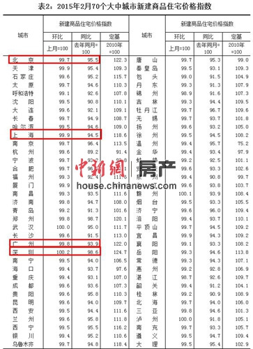 昨日,国家统计局发布了2015年2月份70个大中城市房价变动情况。数据显示,与上月相比,70个大中城市的新房房价有66个下跌,总体降幅比上月扩大了0.1个百分点,二手房的房价环比下降的城市有61个。与去年同月相比,房价数据也延续了一直以来的跌势。