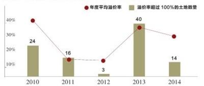 2014年,上海土地市场虽然在年底迎来交易高潮,并以1665亿元的总成交金额成为过去6年的第二高,但在溢价率方面,去年全年上海仅有14幅地块溢价率超过100%。而在2013年,这一数字则是40幅。