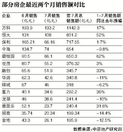 7月销售不积极,多数房企业绩大跌
