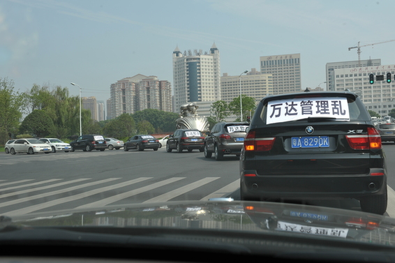 路虎、保时捷、宝马、奔驰……一排豪车后窗玻璃上贴着如上标语,缓缓驶入武汉万达汉街销售部(又称“武汉中央商务区”),自称是武汉万达公馆的业主在现场还拉起了“万达管理乱,迟早要完蛋”的白底黑字横幅。